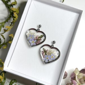 Kõrvarõngad kuivatatud õitest ja epoksiidvaigust “Südamed”- meelespea, kanarbik, metsporgand