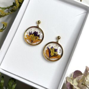 Kõrvarõngad kuivatatud õitest ja epoksiidvaigust – raps, rukkilill, peiulill