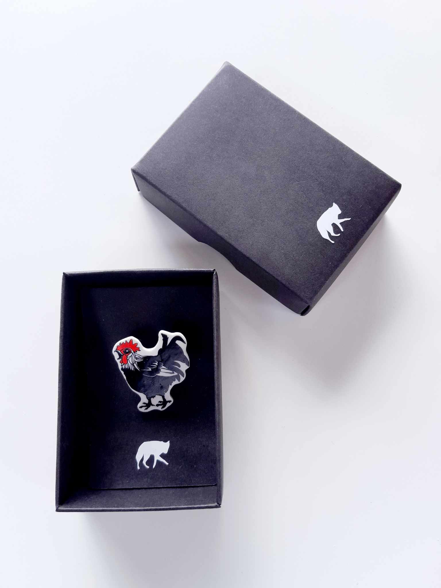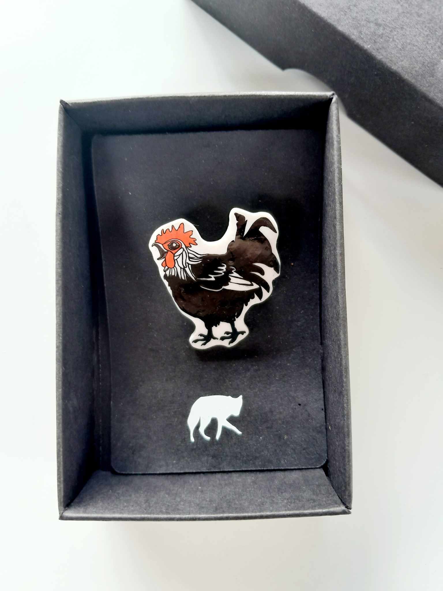 Brooch is handmade – drawn, cut out and baked in the oven.