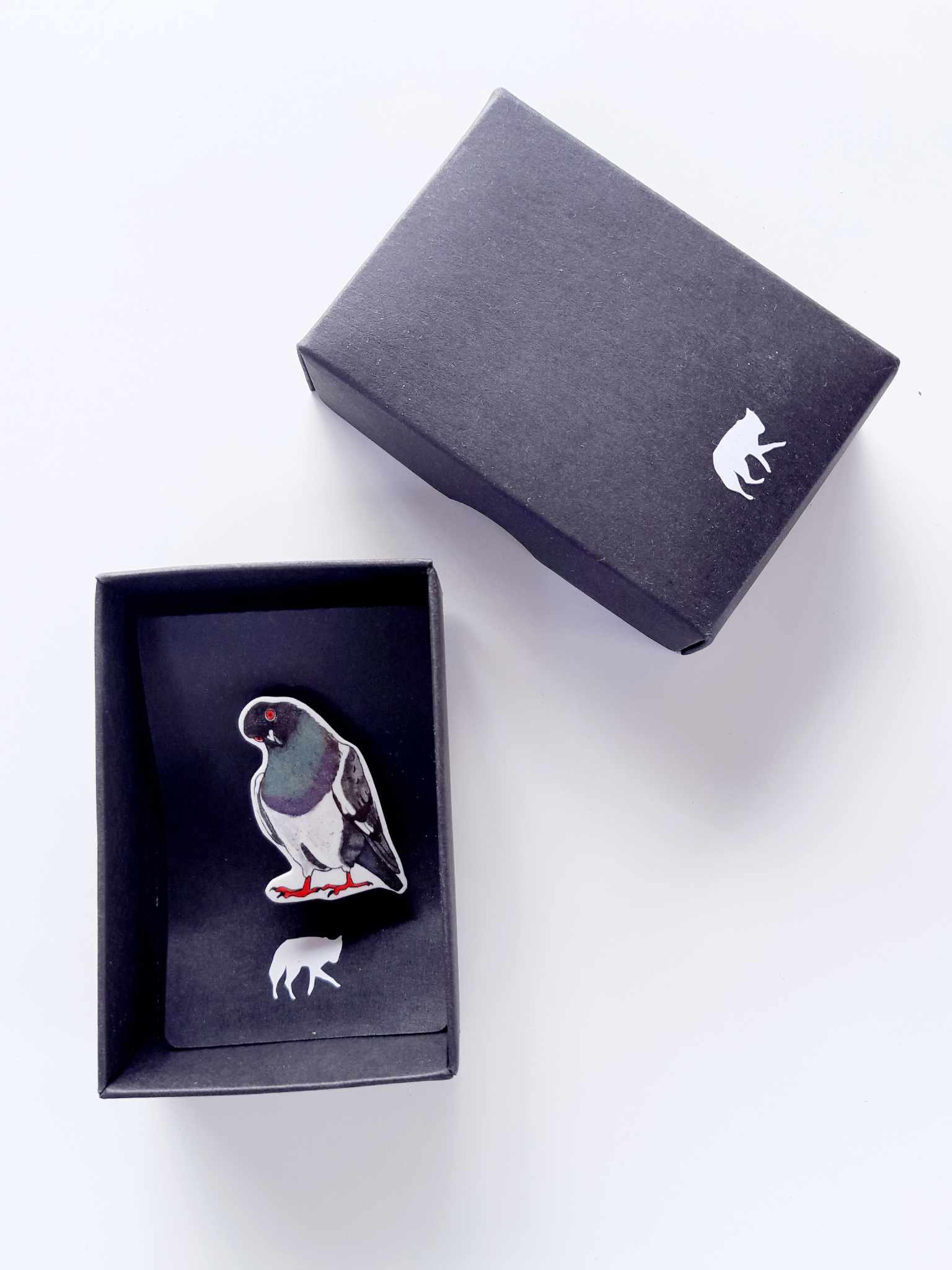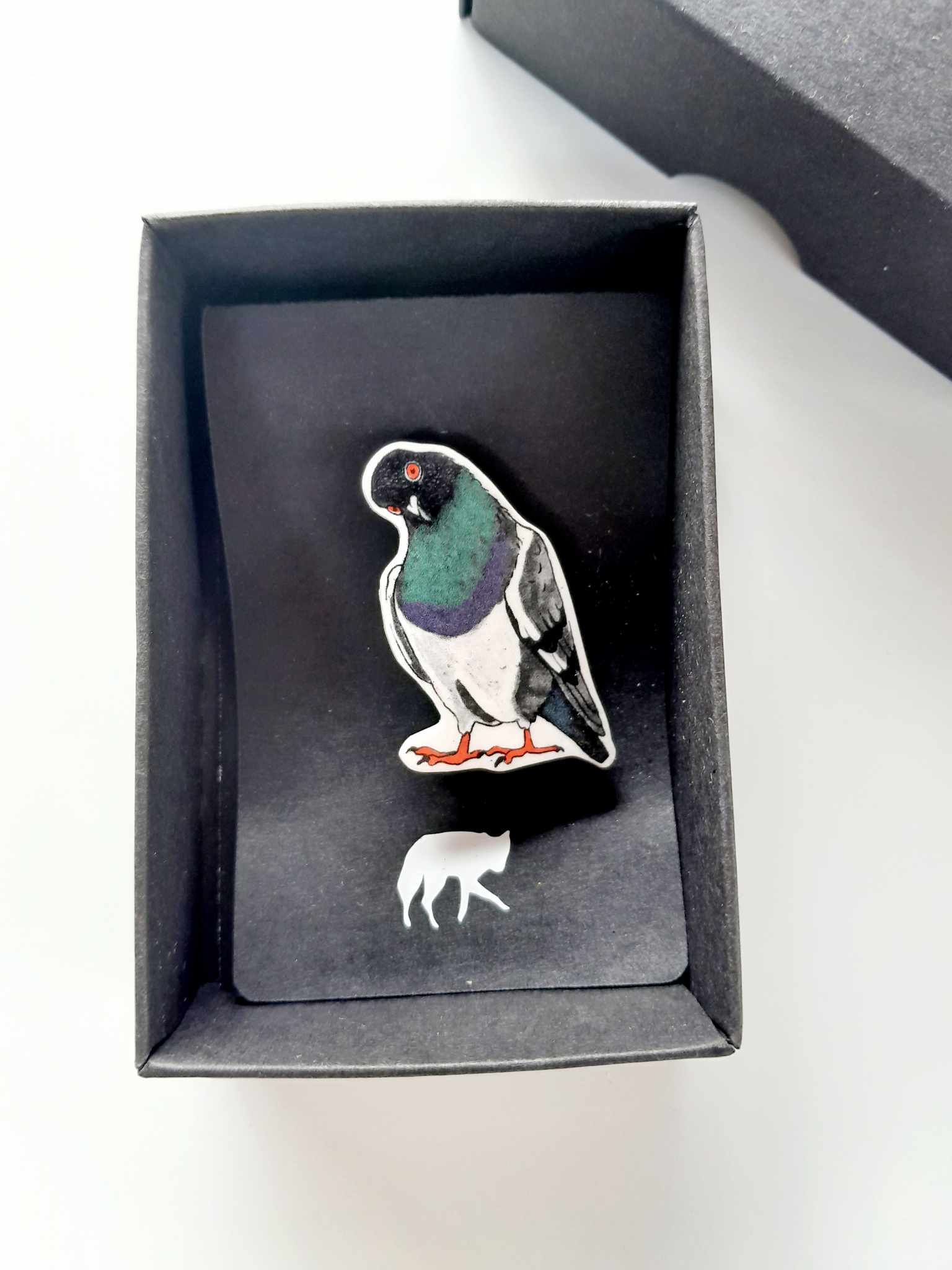 Brooch is handmade – drawn, cut out and baked in the oven.
