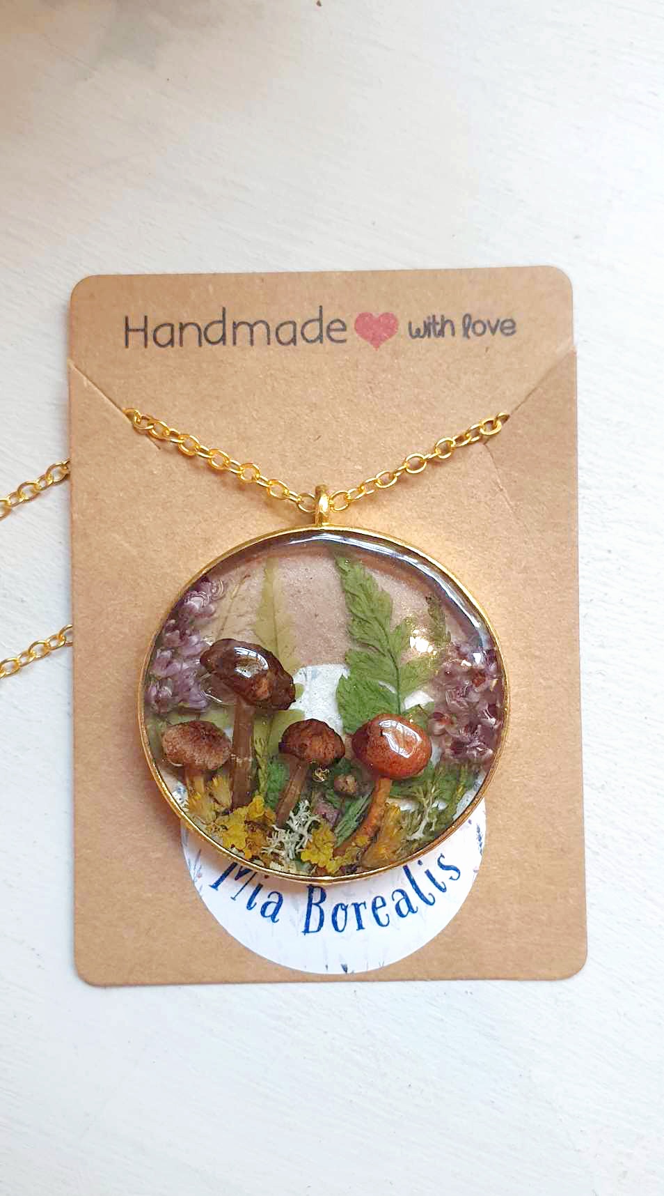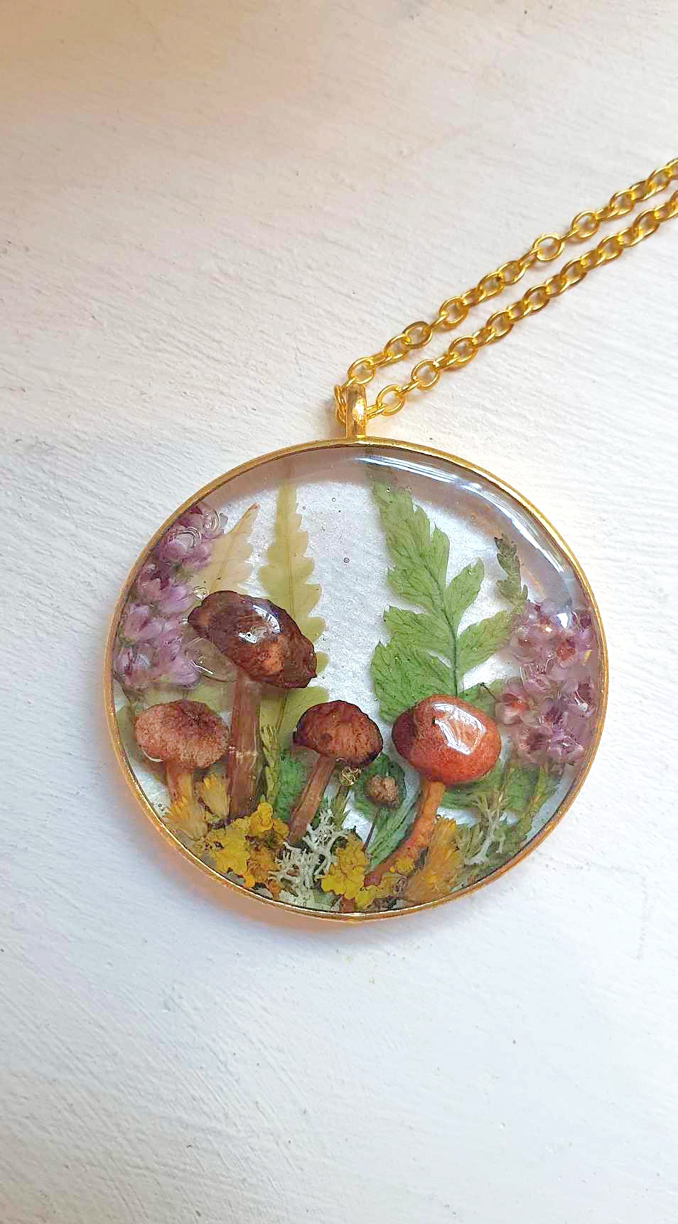 Real plants and mushrooms were used to make this beautiful pendant!