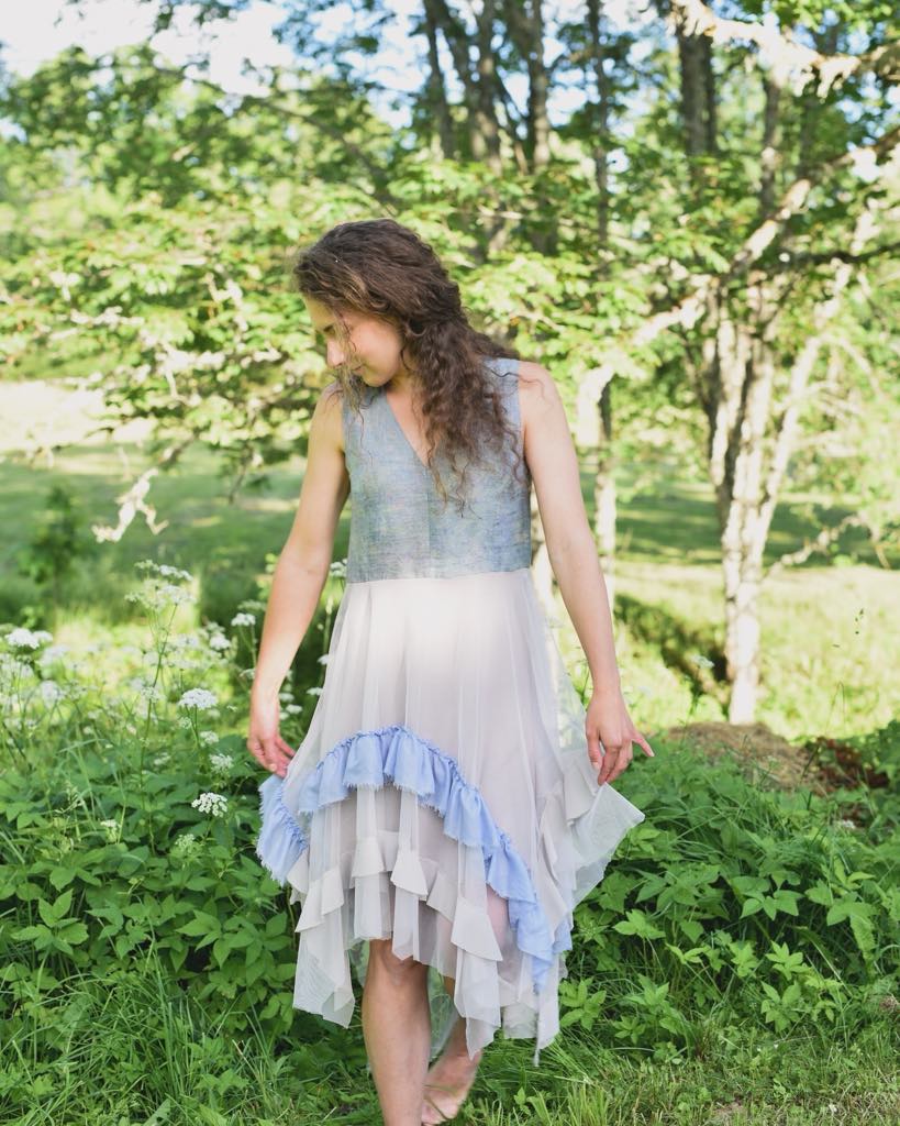 Fabric dyed with plant print has been used to create the dress