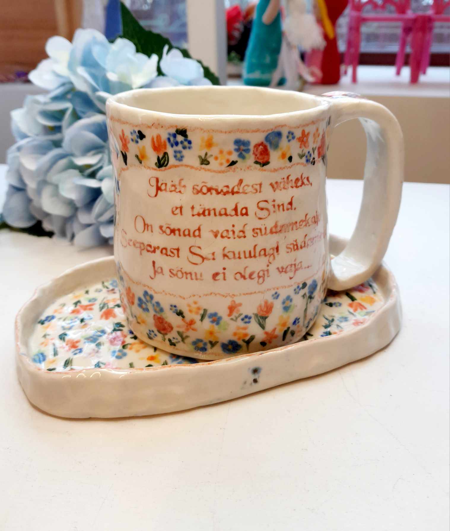 Measurements: Ceramic cup height is 8.5 cm, width 8 cm, plate is 16 x 9.5 cm