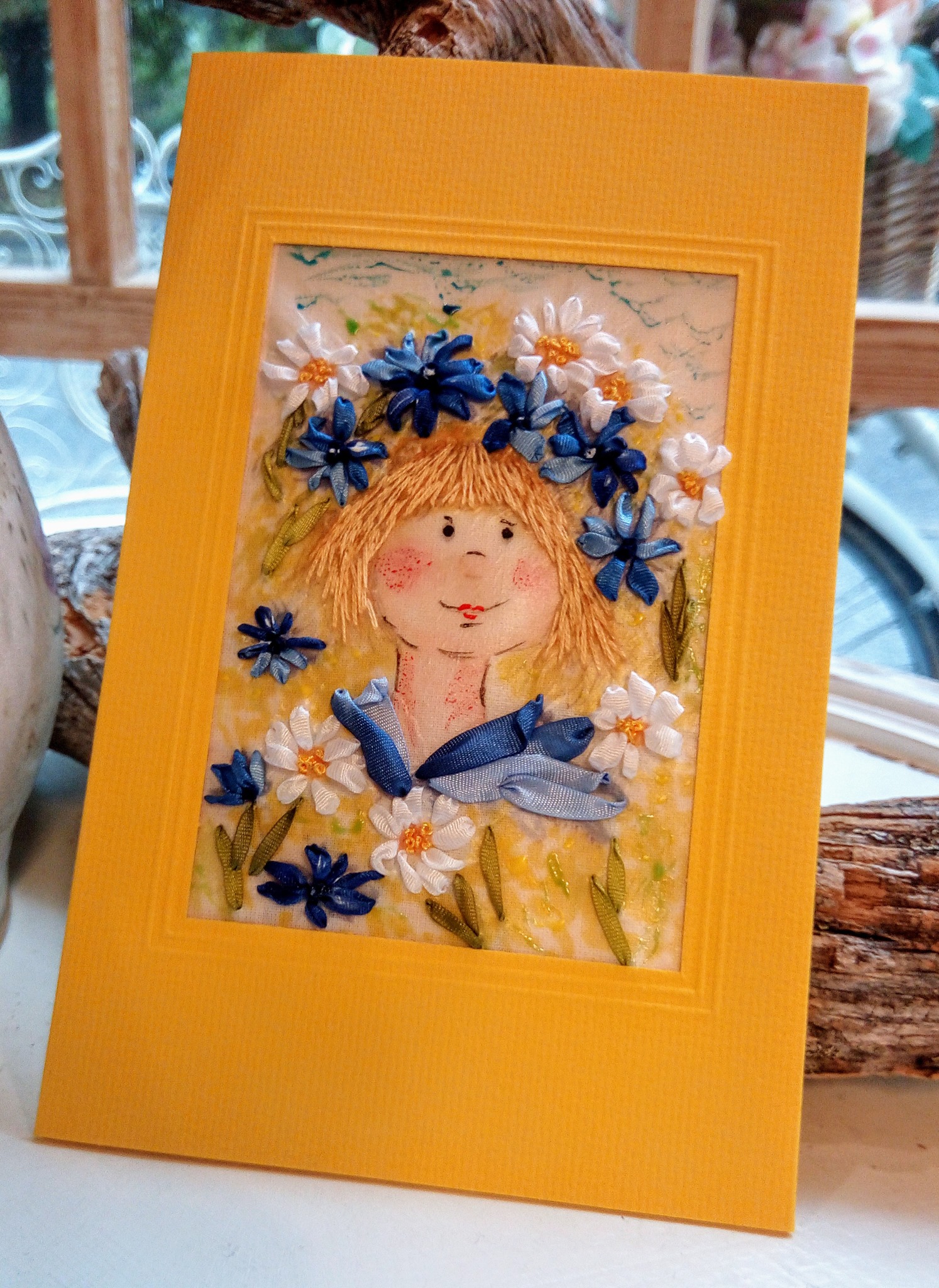 Beautiful flowers are embroidered to the fabric and mastered as a greeting card.