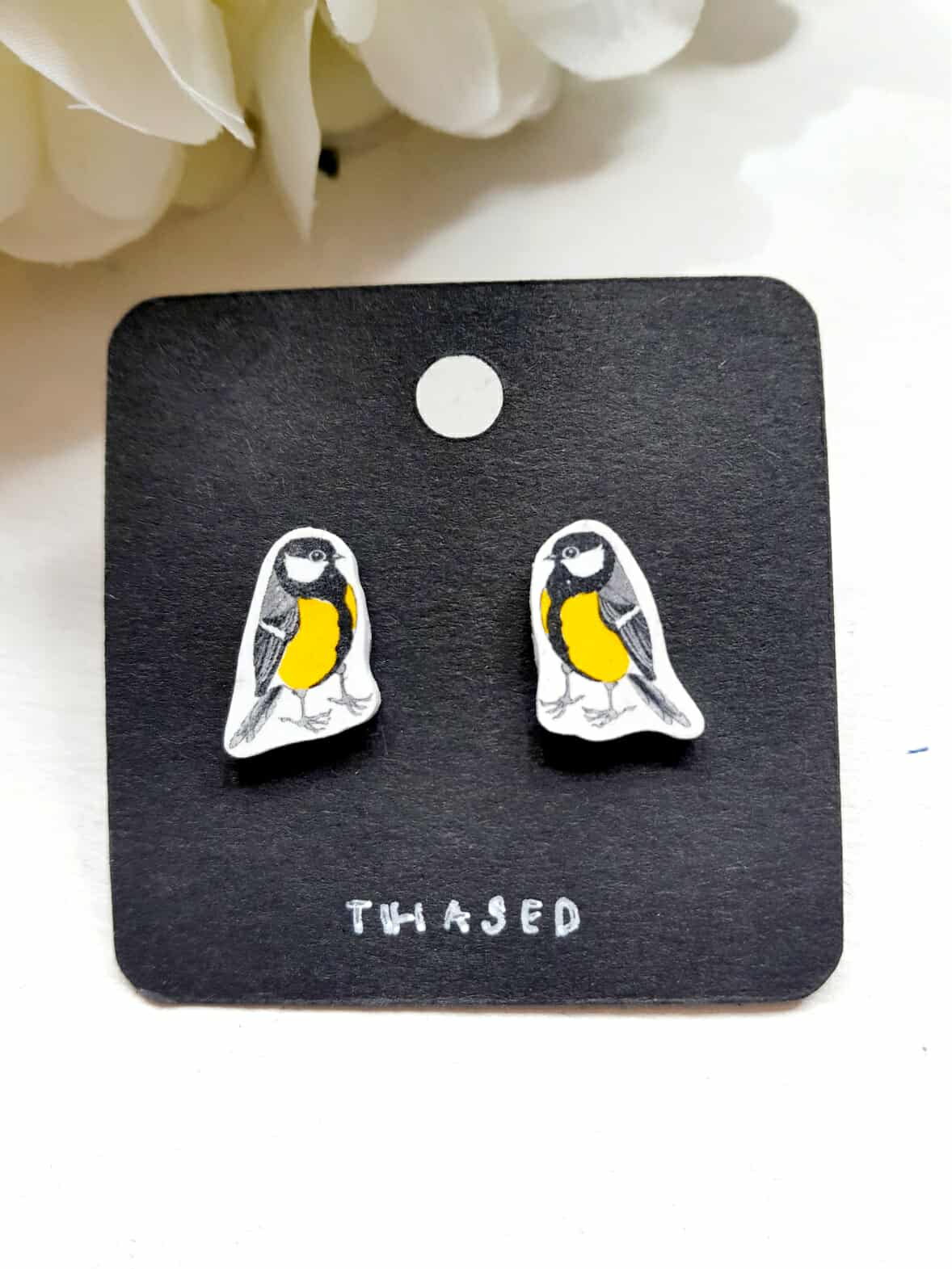 The earrings are handmade – drawn, cut out and baked in the oven.