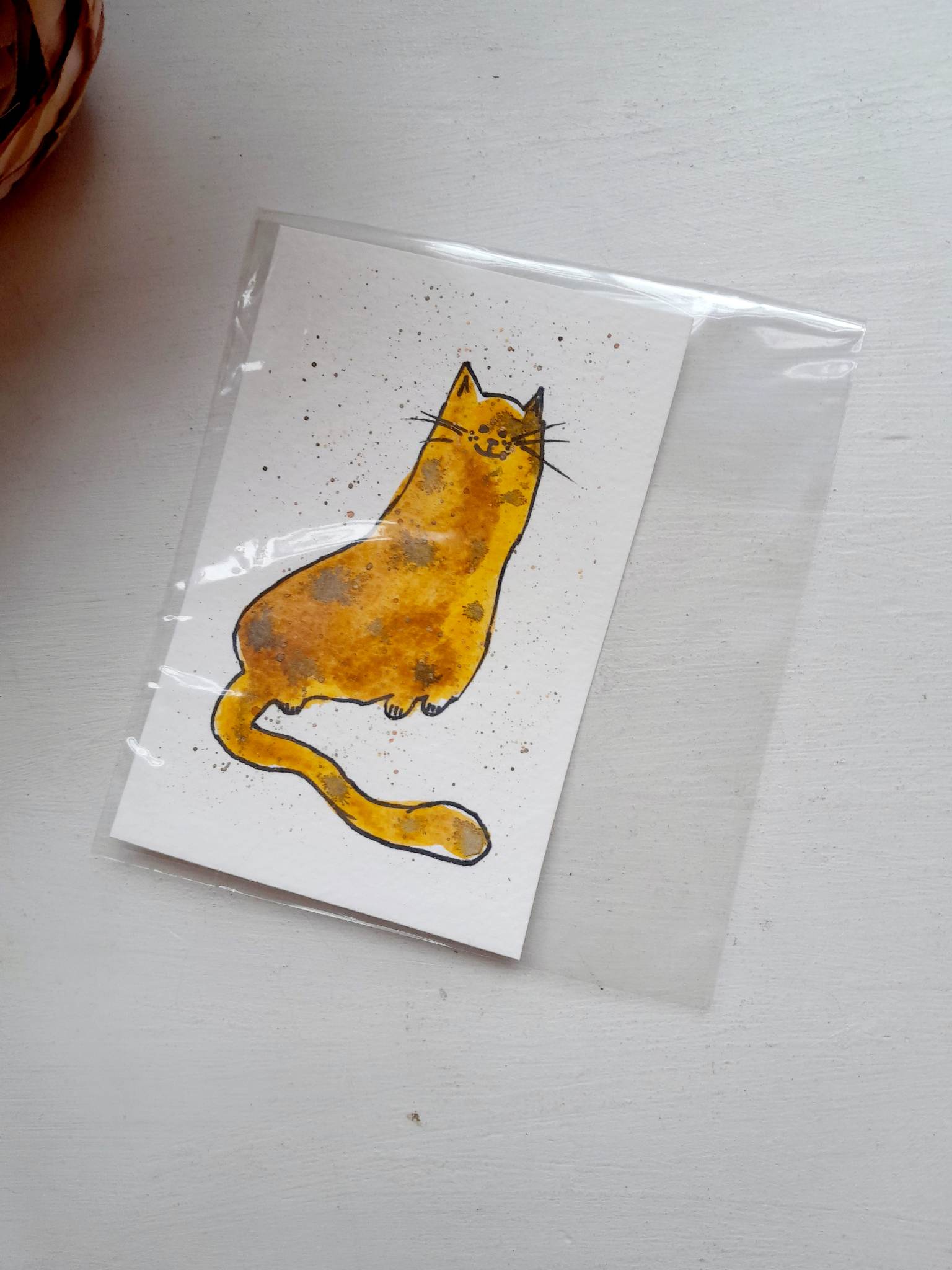 Kauni akrüülmaalinguga kaart “Pika kollase sabaga kass”