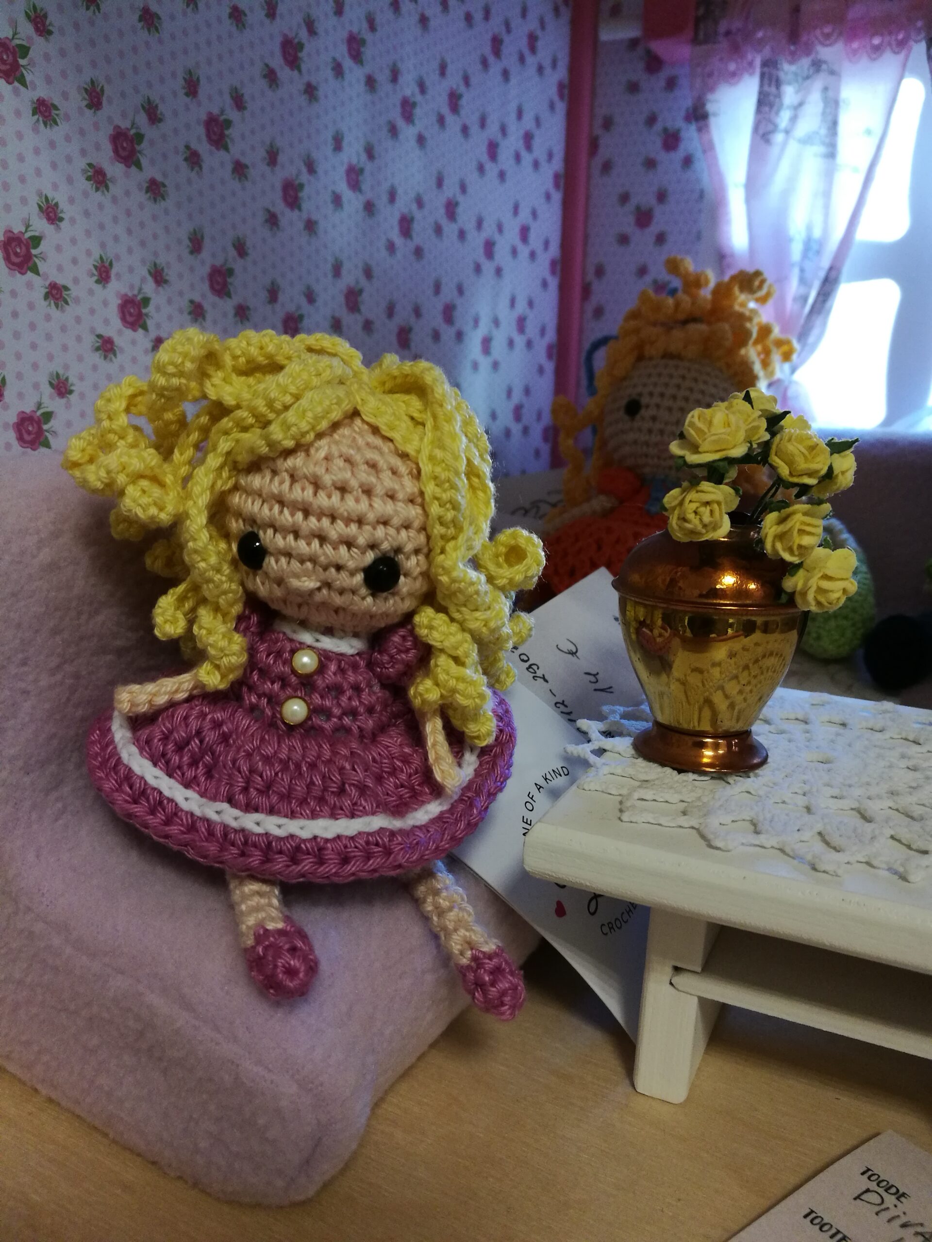 Amigurumi stiilis heegeldatud Tuhkatriinu. Amigurumiks nimetatakse Jaapanist pärit kunsti- heegeldatud või kootud pehmed loomad.