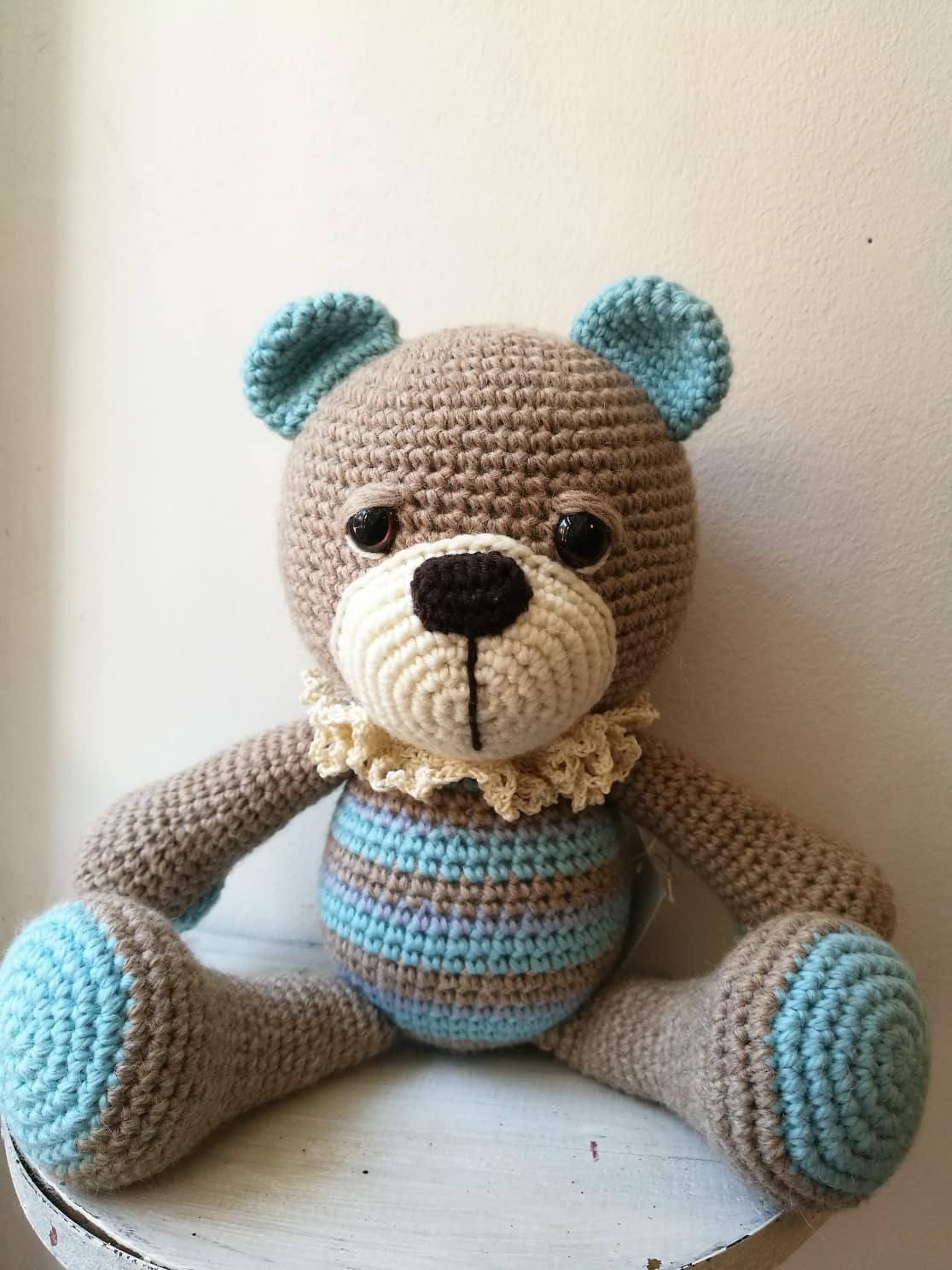 Amigurumi stiilis heegeldatud unine Mõmmi. Amigurumiks nimetatakse Jaapanist pärit kunsti- heegeldatud või kootud pehmed loomad.