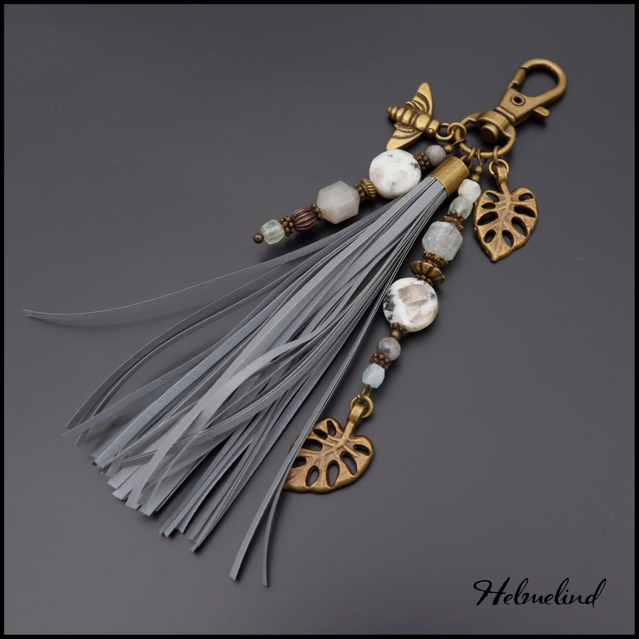 Käsitööna valminud poolvääriskividest helkiv ripats karabiinkinnitusega.