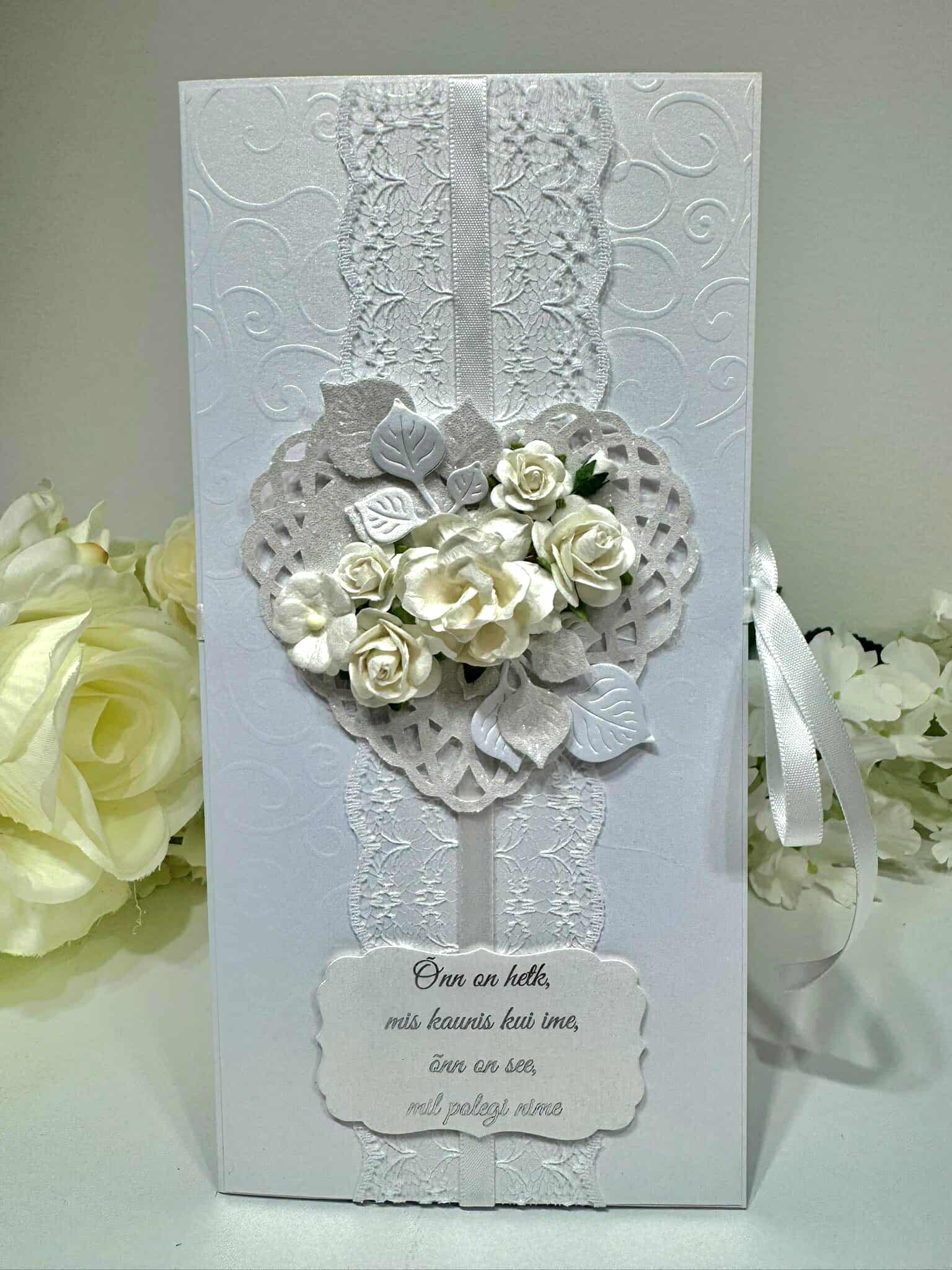Kaunis käsitsi valmistatud pulmakaart, sõlmitav kokku paelaga.