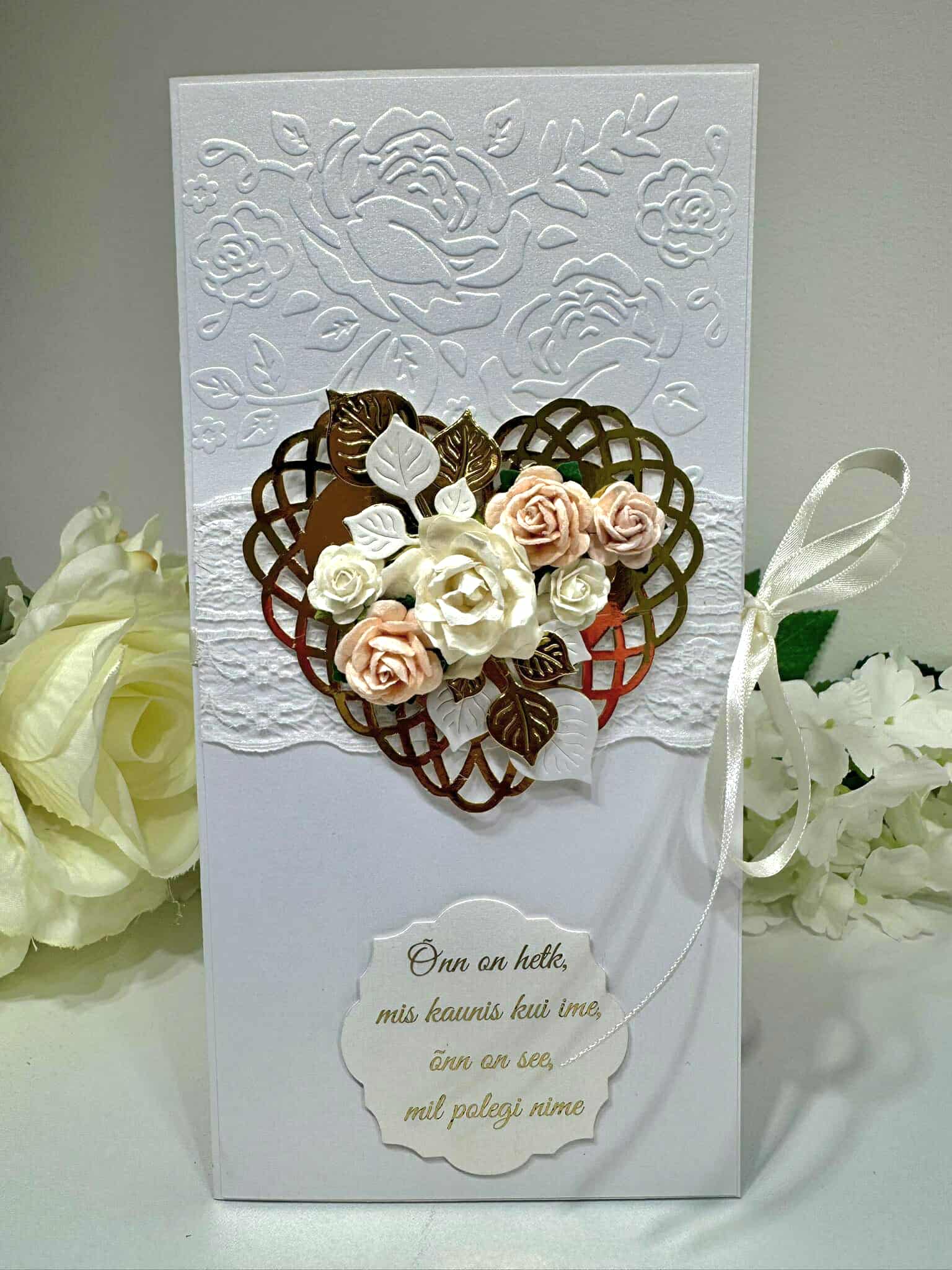 Õnnitluskaart pulmadeks, rahataskuga, paelaga kokku sõlmitav.