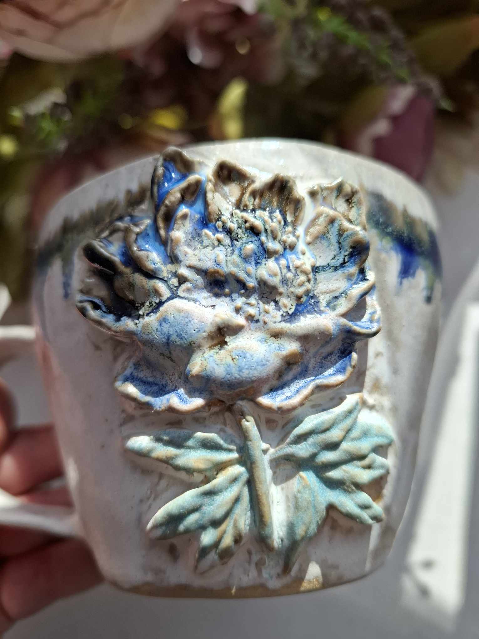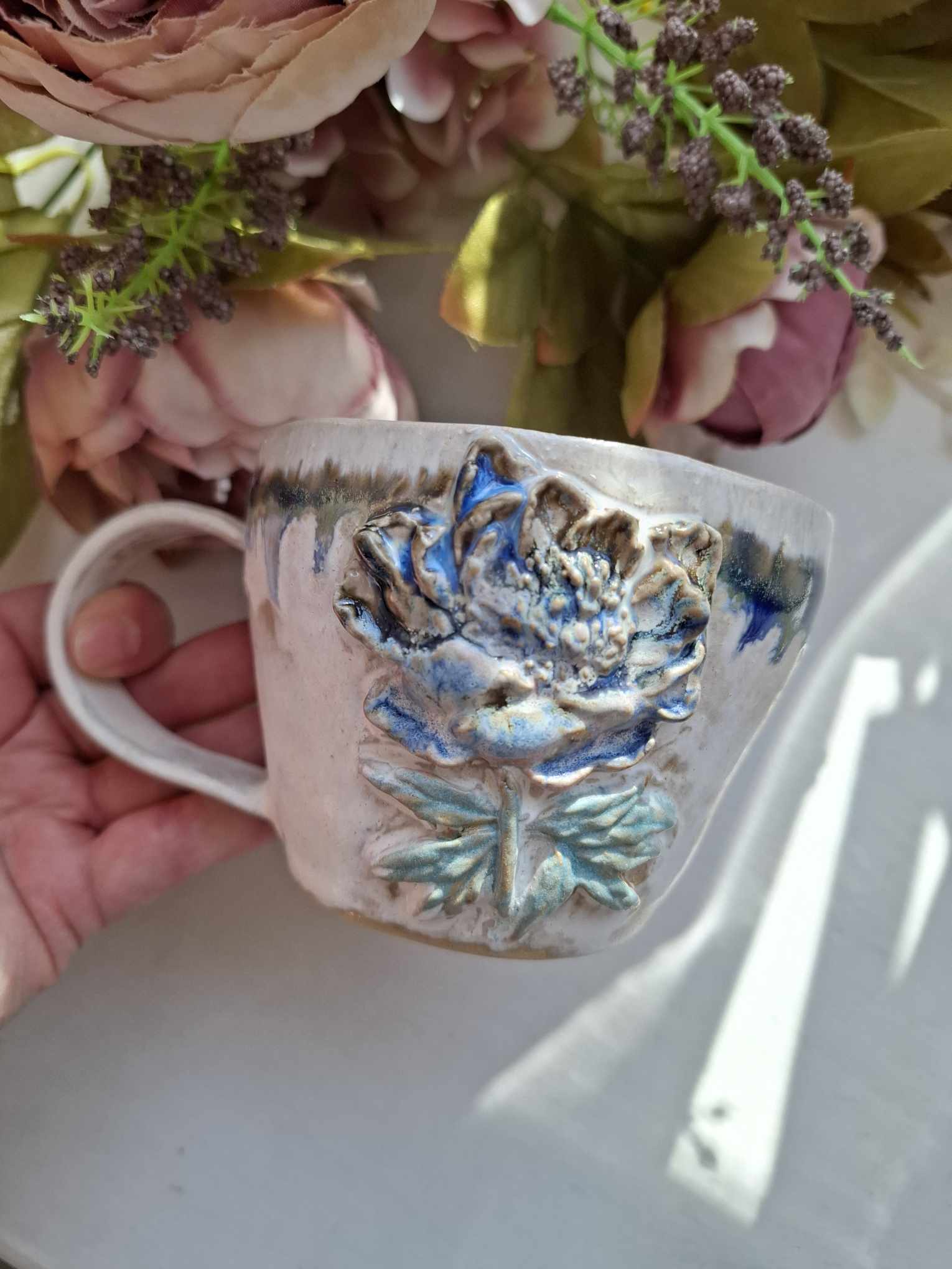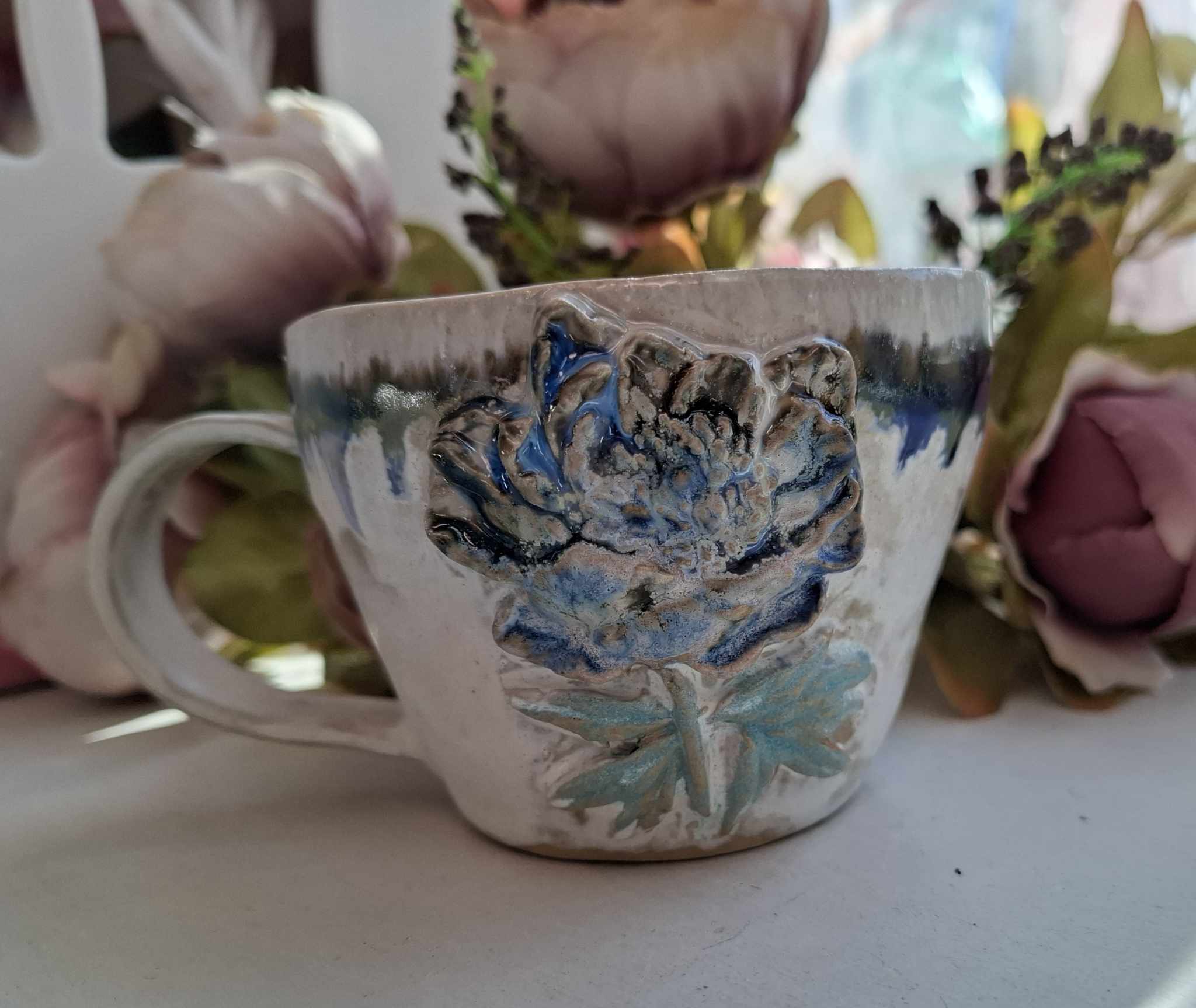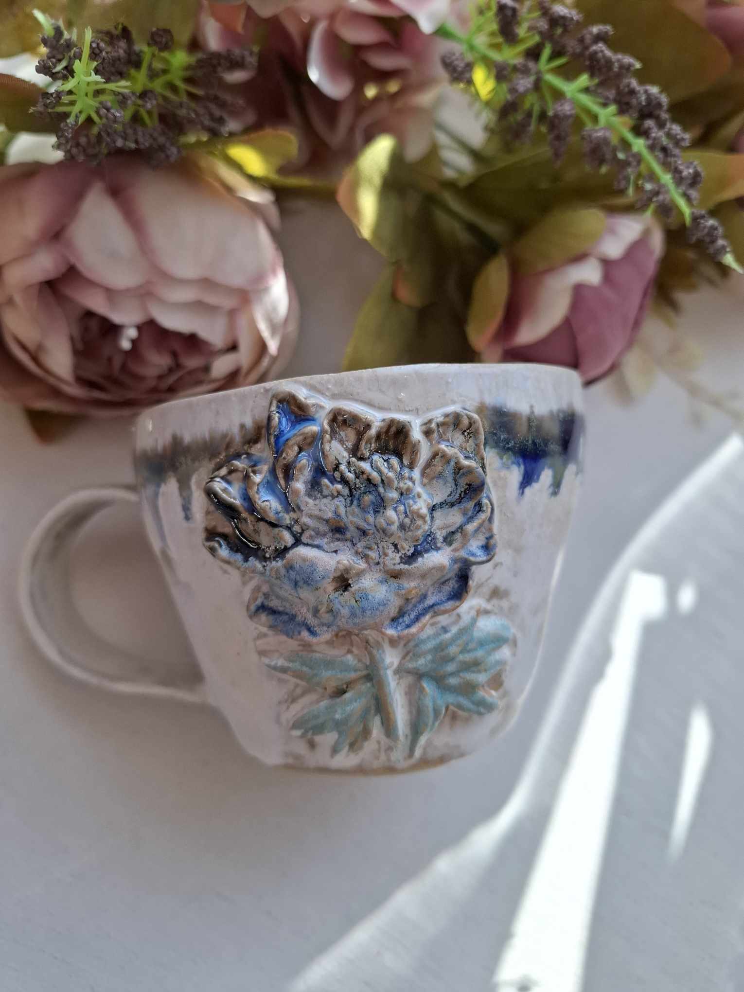 Käsitööna valminud kruus on mõnusalt suur, et nautida nii teed kui piimaga kohvi.