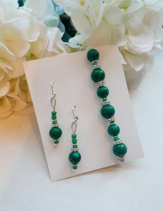 Kõrvarõngad ja käevõru on kaunistatud imelise malahhiidiga.
