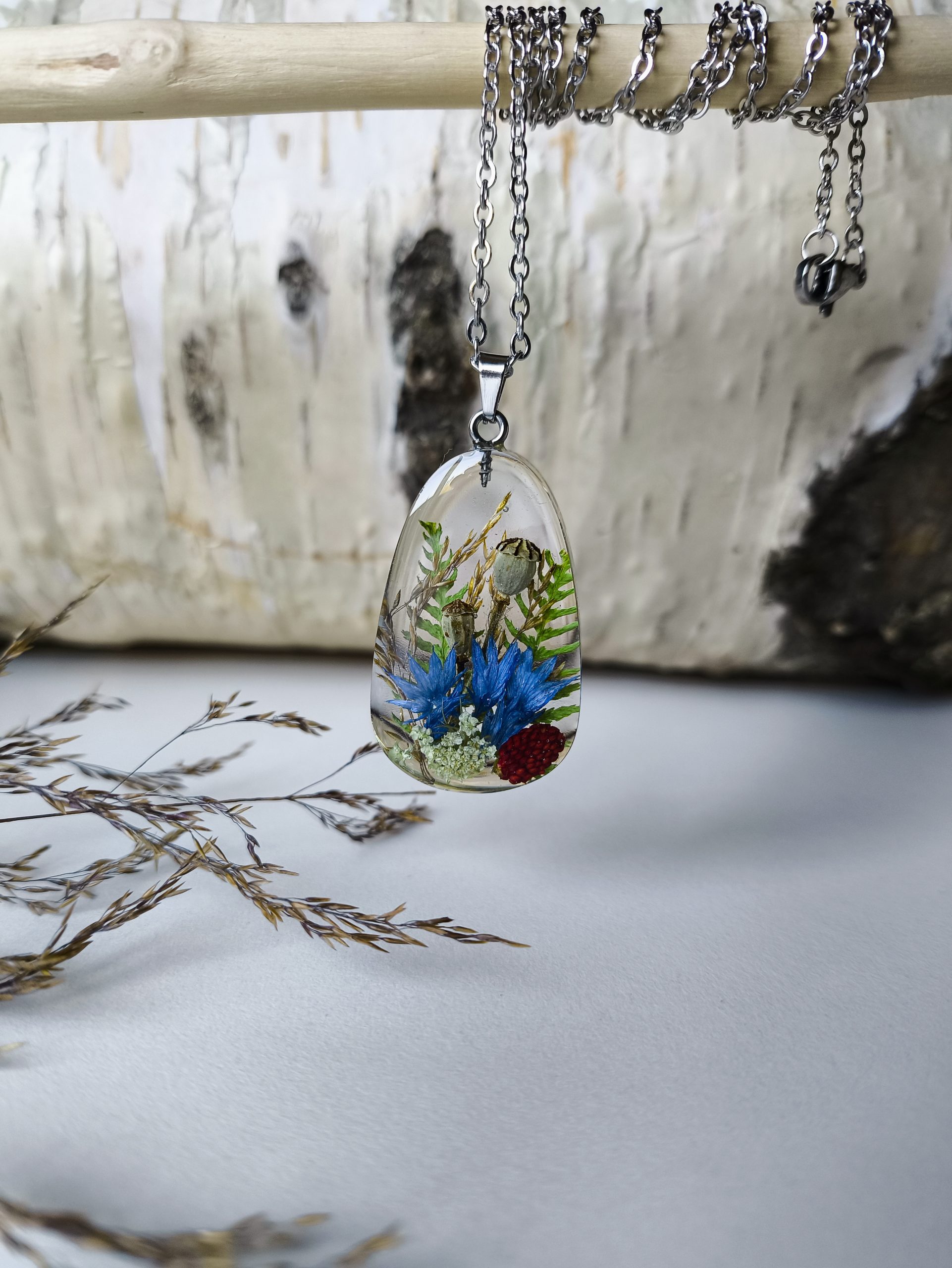 Kaelaehe epoksiidvaigust ja kuivatatud taimedest – rukkilill, metsmaasikas, metsporgand, moonikupar, sõnajalg, kõrreline