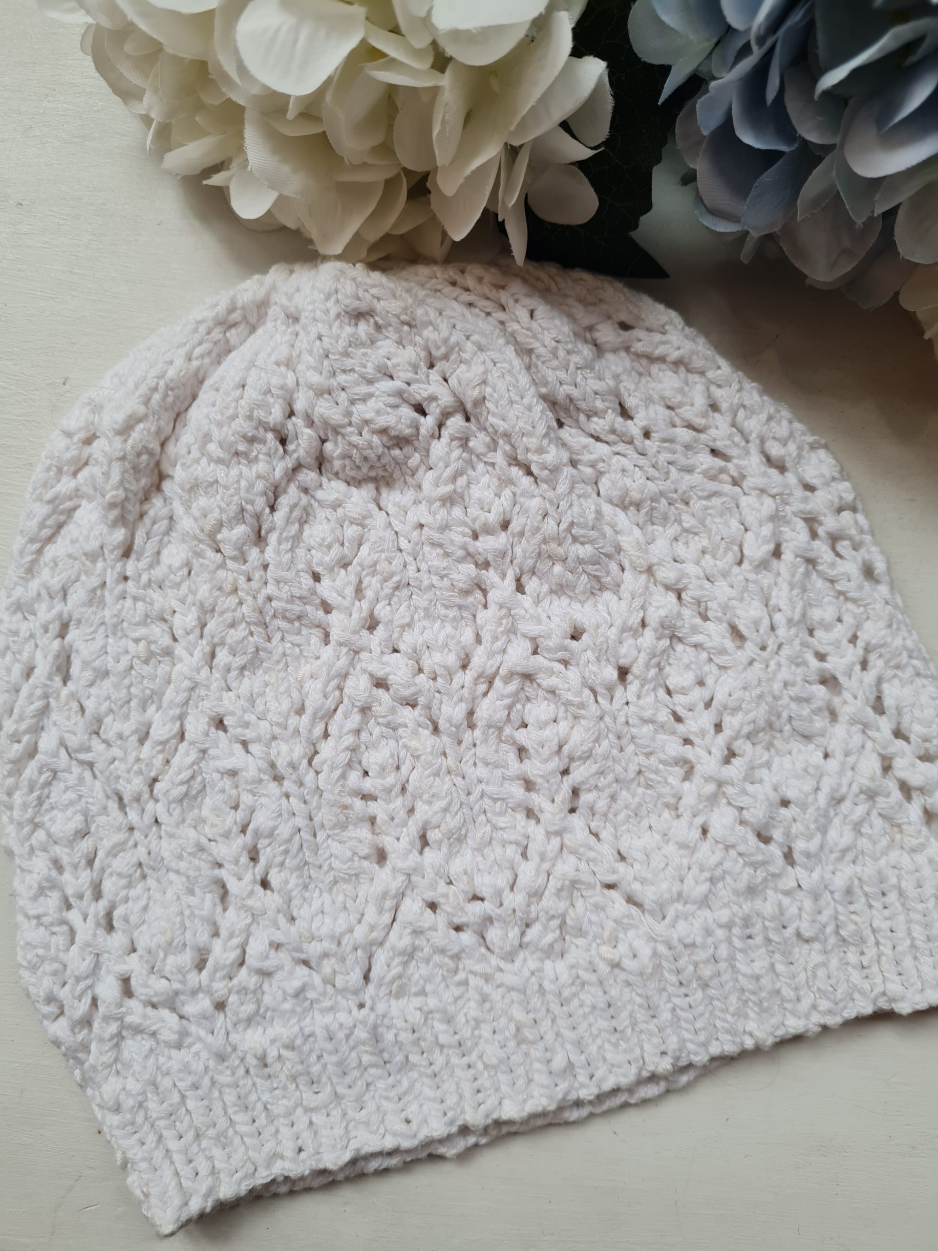 Käsitsi kootud valge müts puuvillasest lõngast