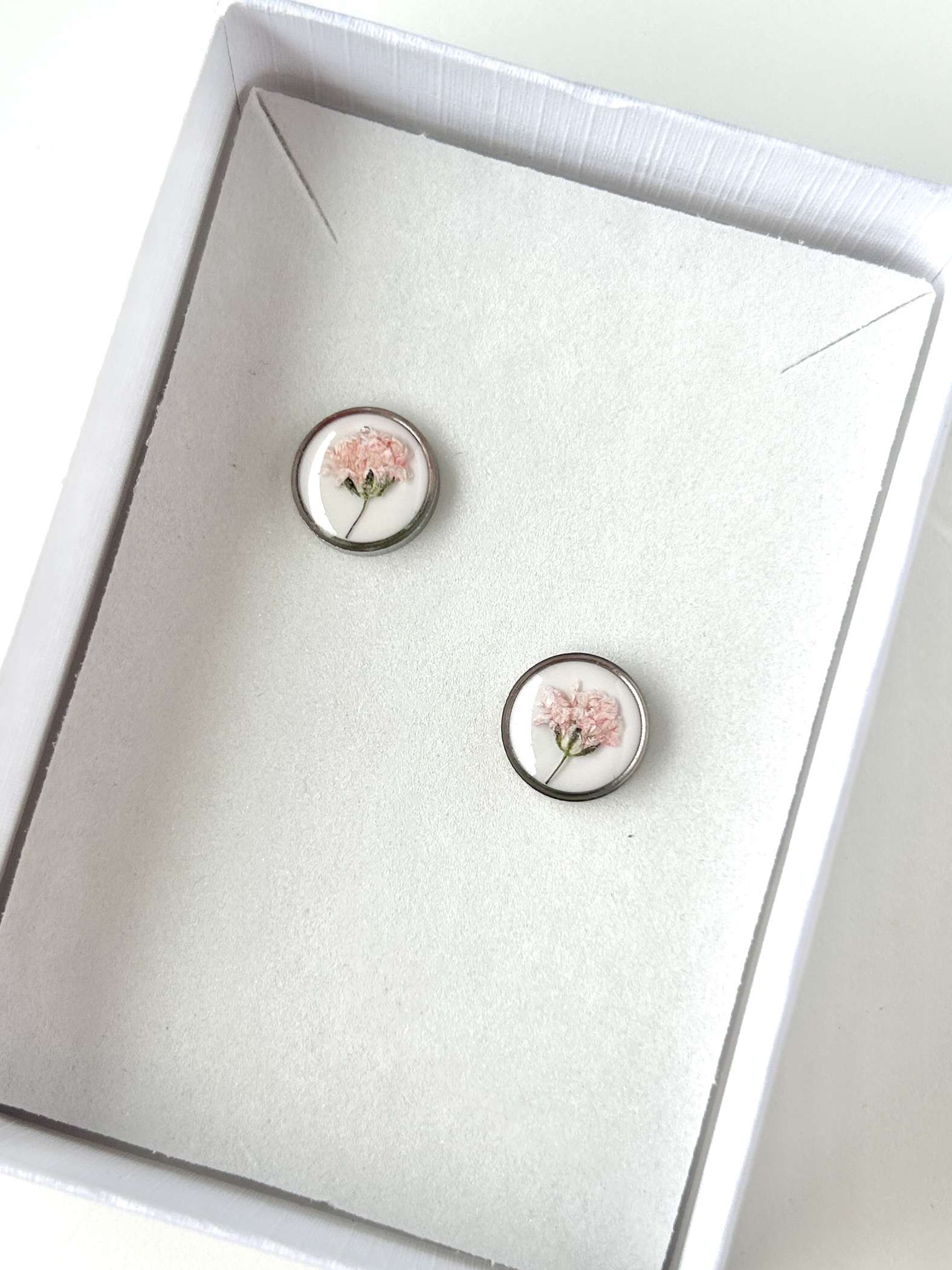 Kaunid käsitööna valminud kõrvarõngad kuivatatud õite ning epoksiidvaiguga.