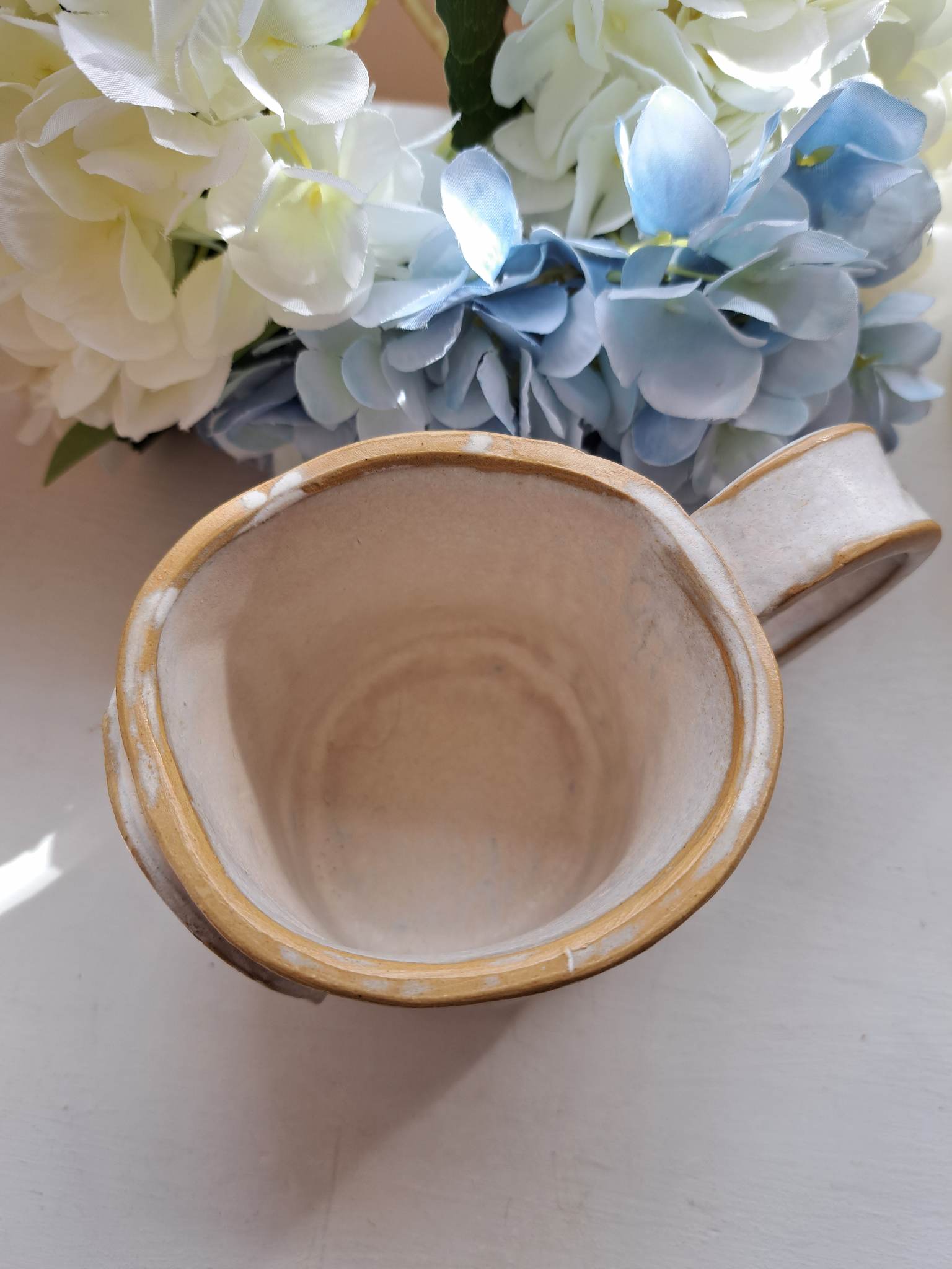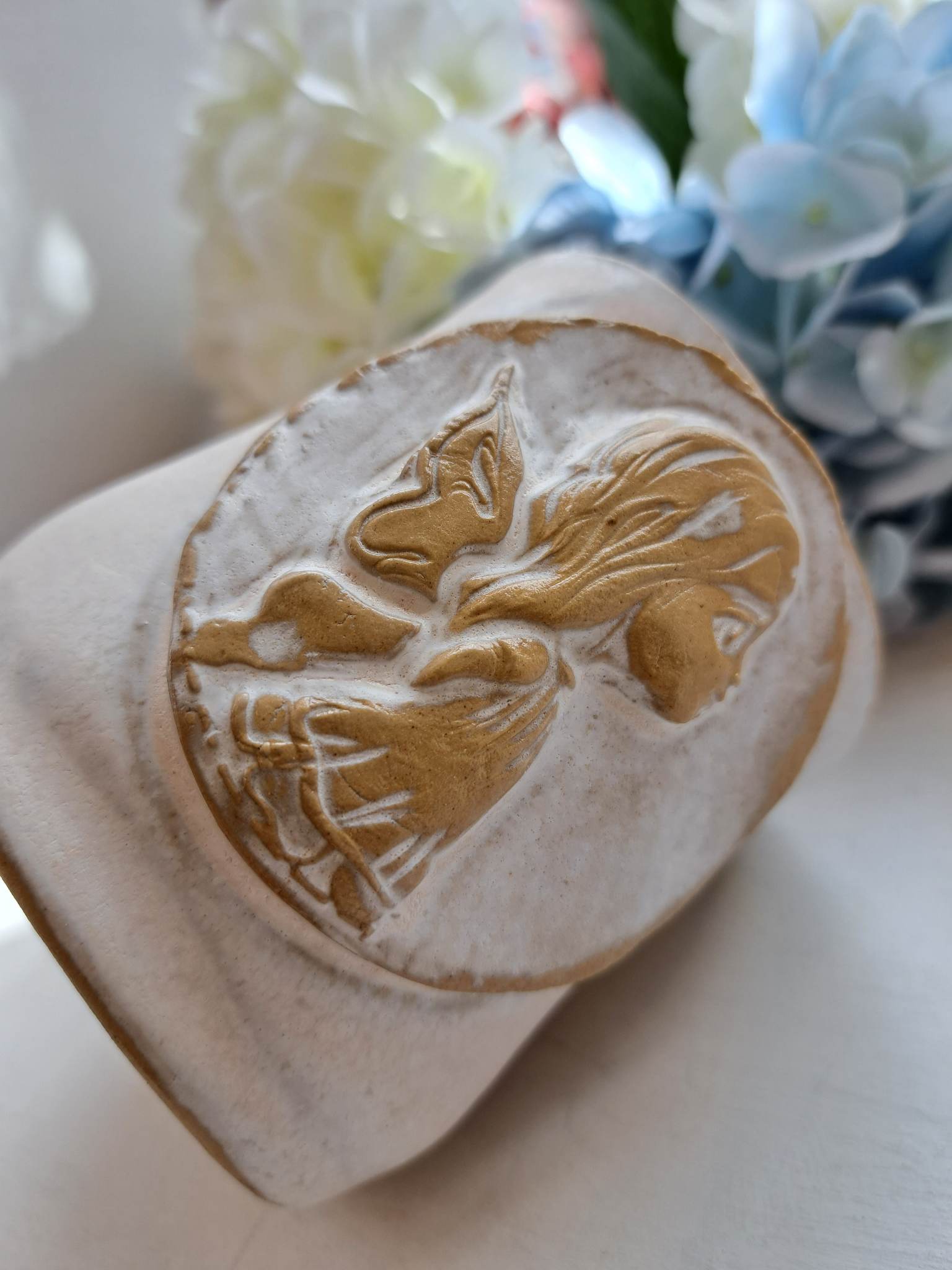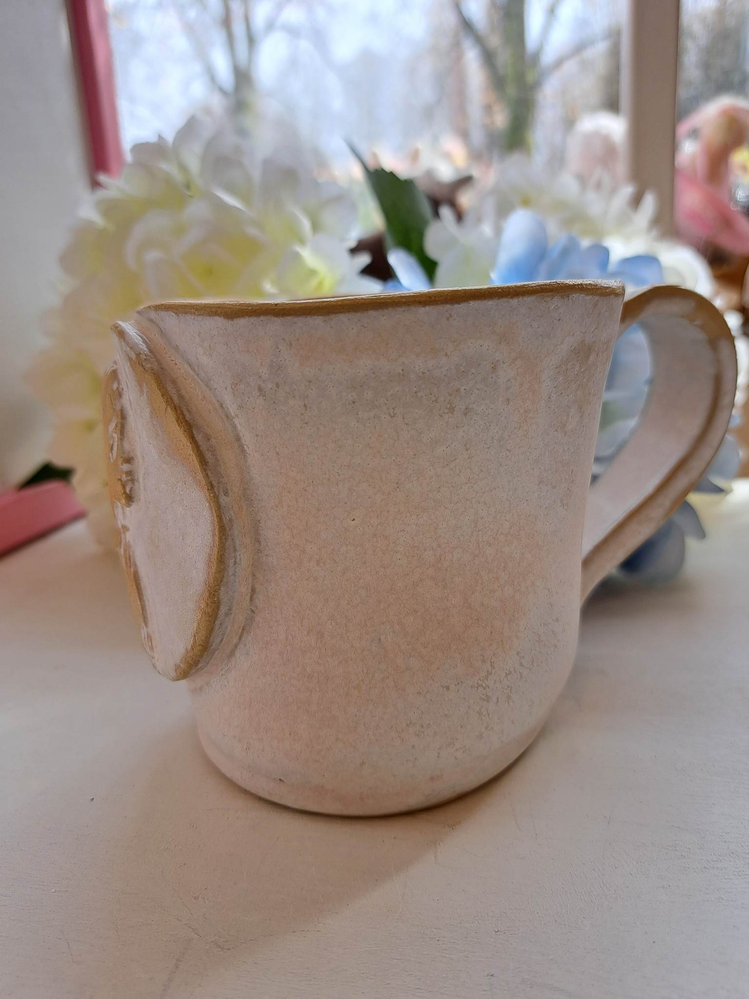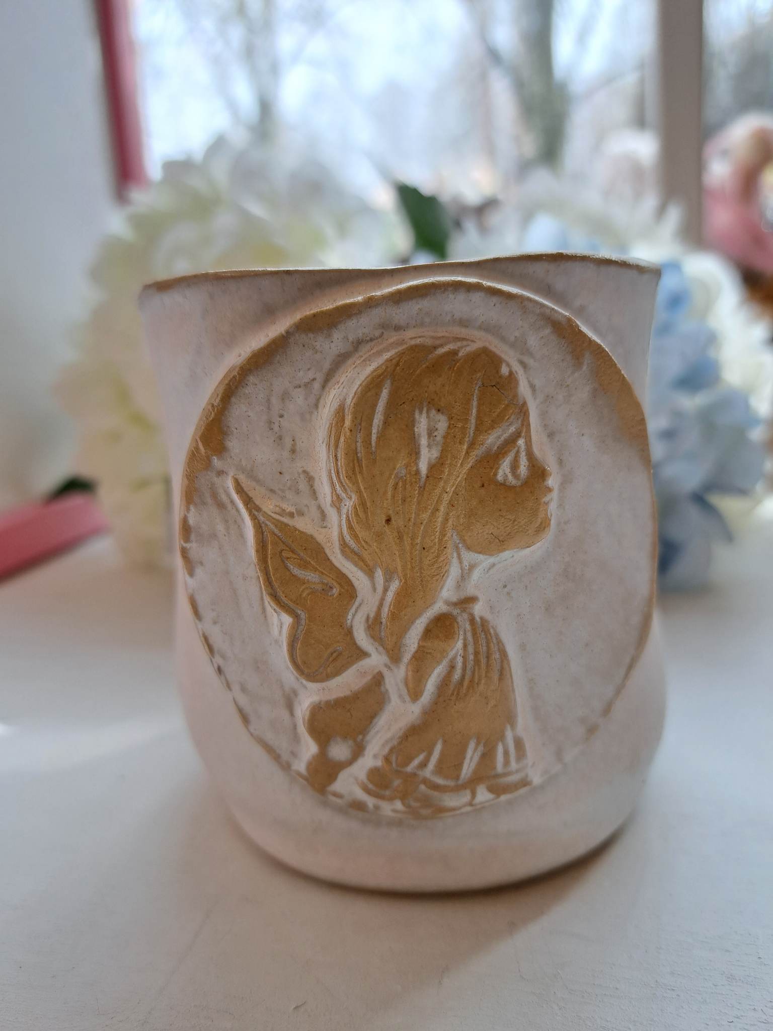 Käsitööna valminud kruusile on kaunistatud ingli graveeringuga.