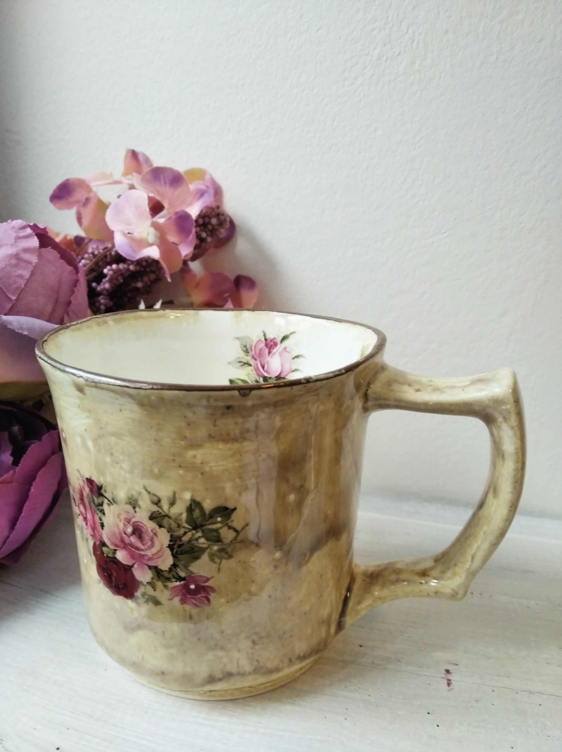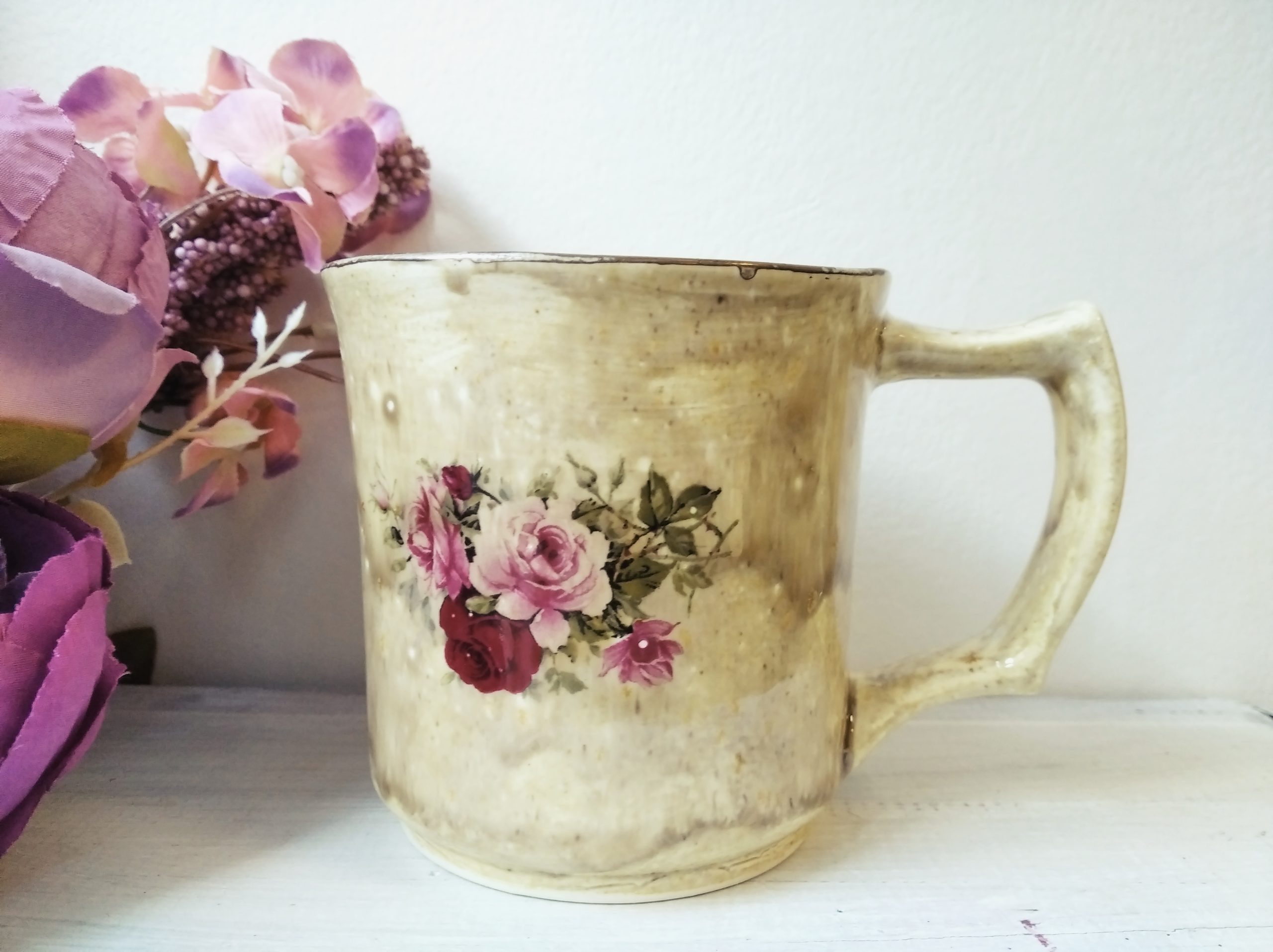 Roosidega kuldse äärega keraamiline kruus, keskmine