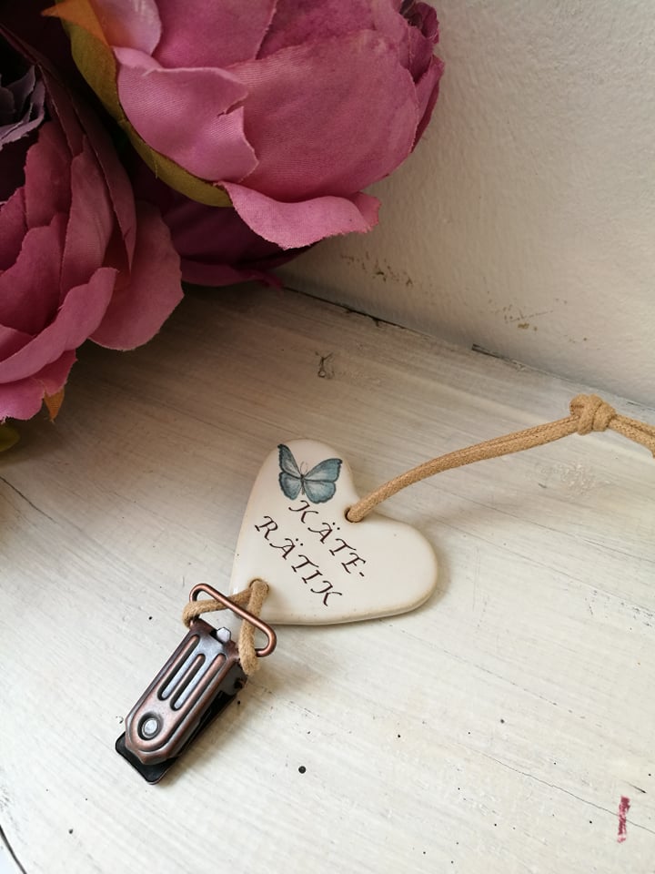 Kaunis käterätikuhoidja, mida kaunistab südamekujuline liblika pildiga keraamikast kaunistus, on imeline kingitus igale köögis kokkamist nautivale inimesele.