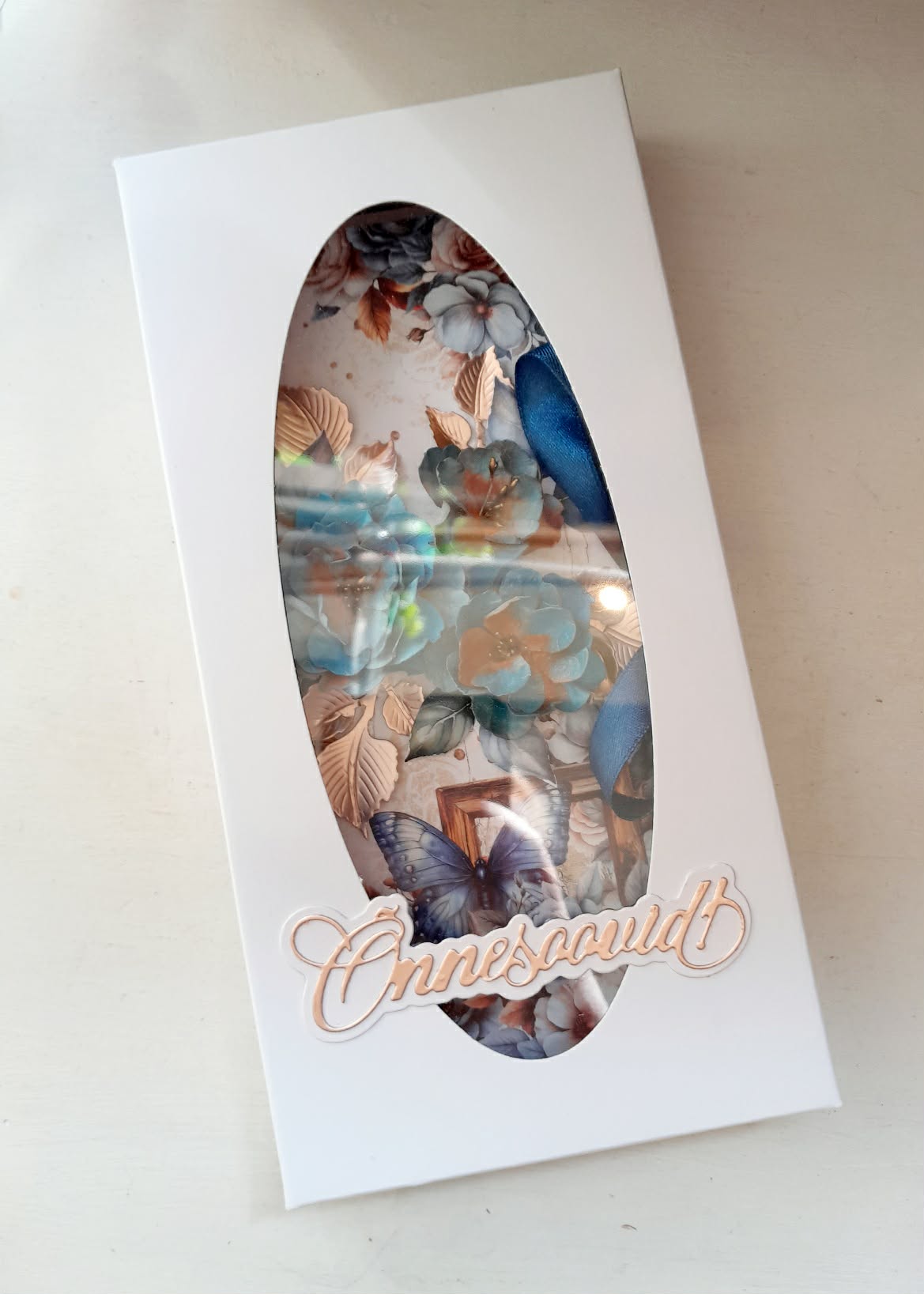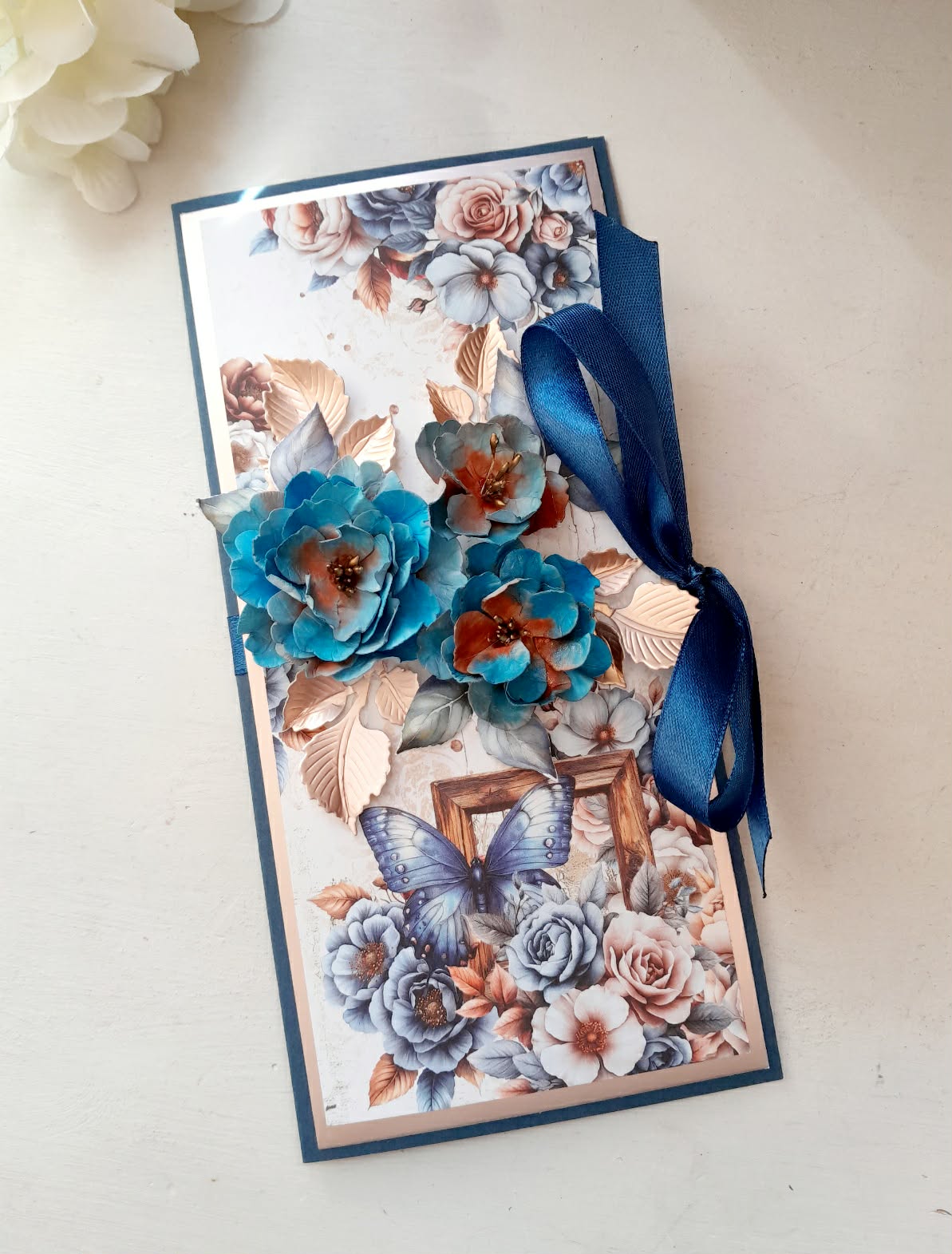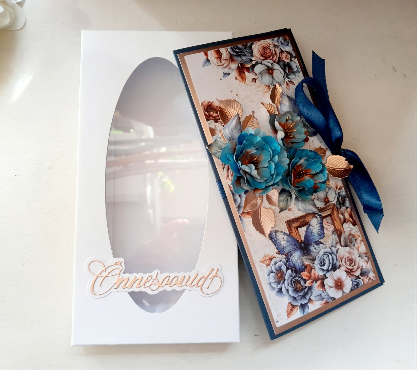 Tähtpäevaks käsitööna valmistatud kaart, rahatasku lisamise võimalusega.