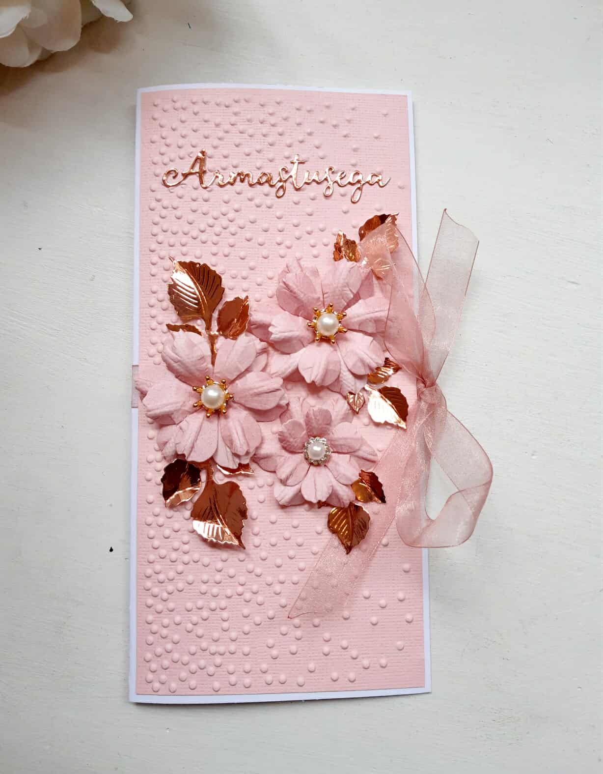 Käsitööna valmistatud kaart pulmadeks õnnesoovide edastamiseks.