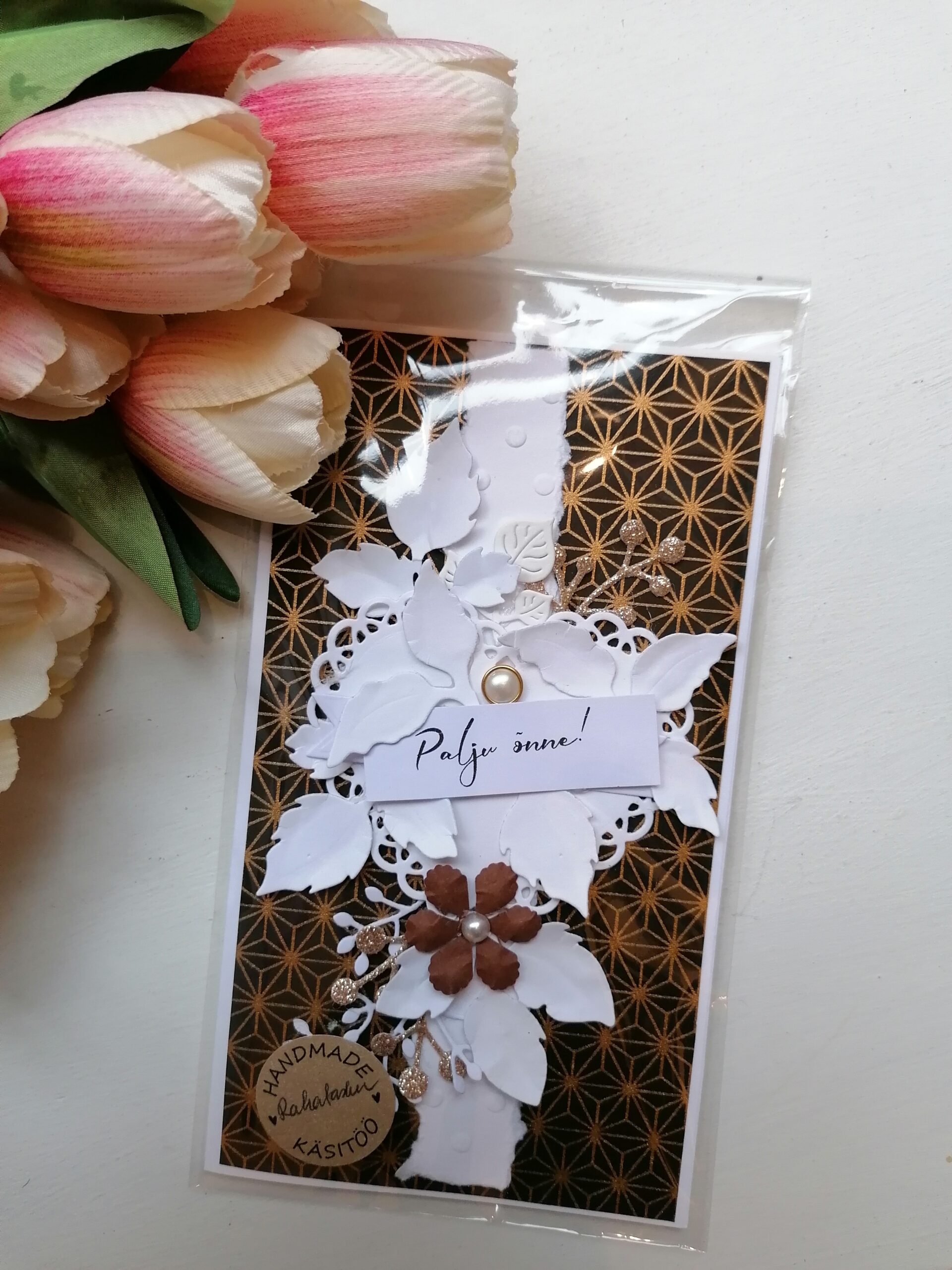 Käsitööna valminud rahataskuga kaart õnnitlemiseks.