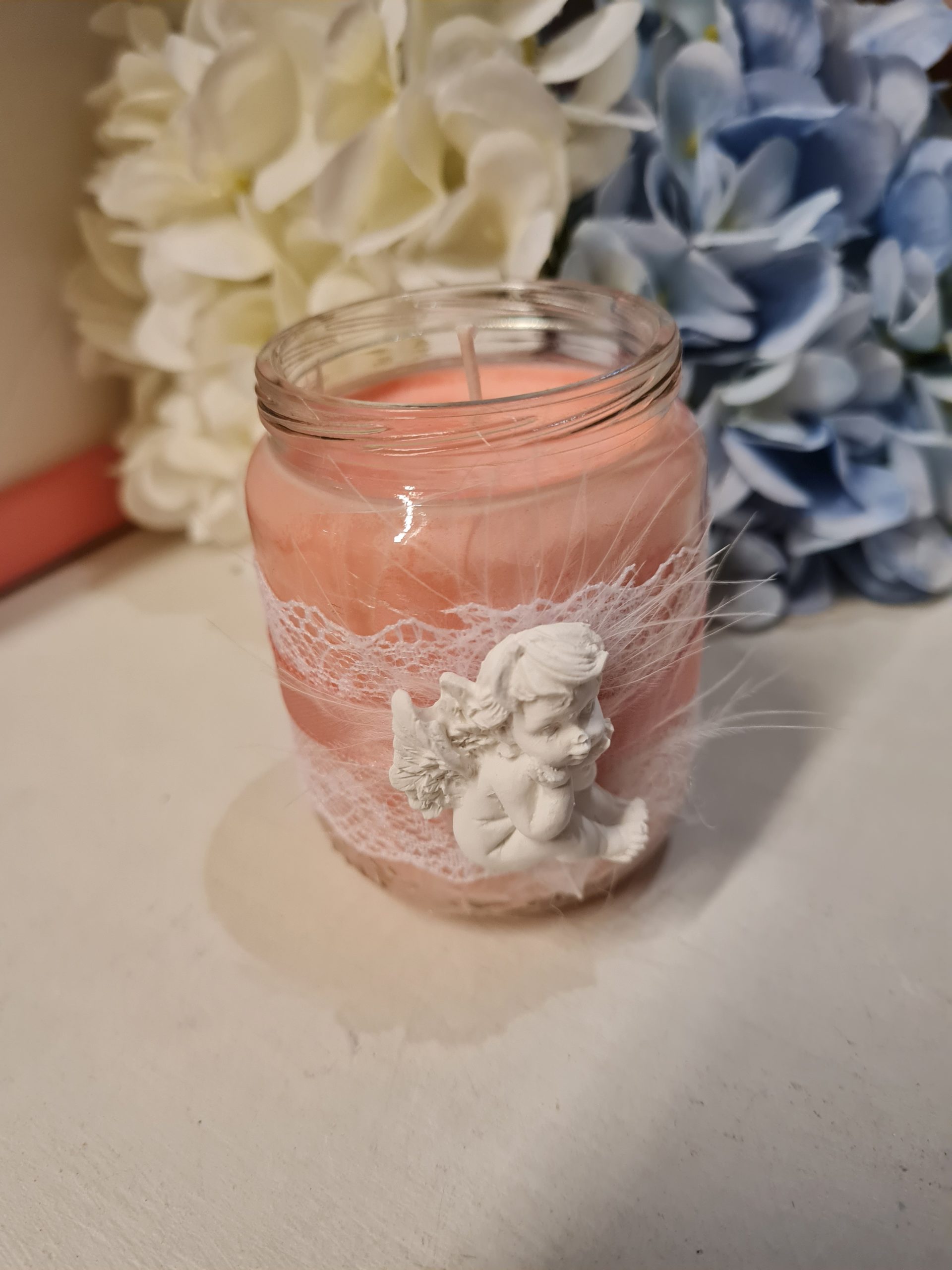 Sojavahast käsitööküünal pitsi ja ingliga