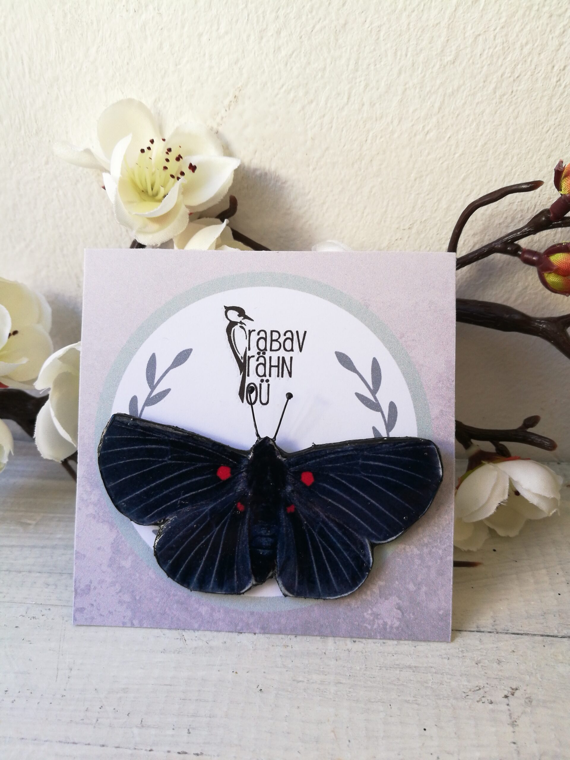 Tumesinist värvi punaste täppidega liblikakujuline pross