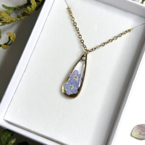 Kaelaehe kuivatatud õitest ja epoksiidvaigust – meelespea, raps, ussikeel