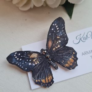 Käsitsi meisterdatud kaunis liblikakujuline pross karbis, õhtusoojuse toonid
