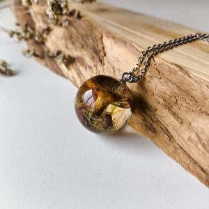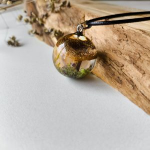 Kerakujulise ripatsiga kaelaehe epoksiidvaigust ja kuivatatud taimedest – seen, kanarbik, porosamblik, põdrasamblik, sammal